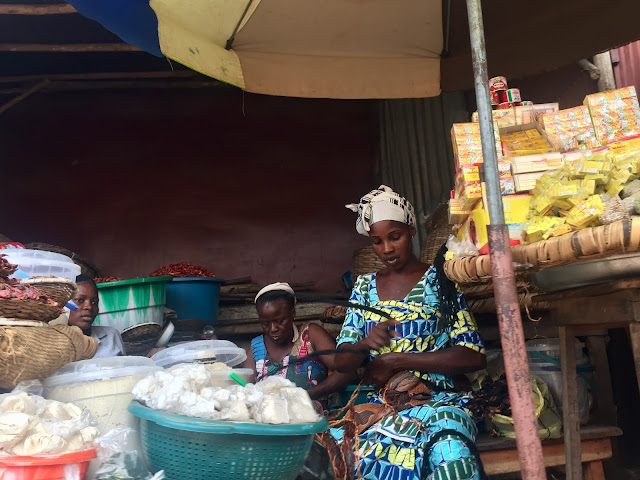 Para ver mejor la esencia de Cotonou, fuimos a un "must-see": el Mercado de Dantokpa, uno de los mayores del África occidental con 20 hectareas (unos 40 campos de futbol). Accedimos por la pasarela que atraviesa la arteria Saint Michel. Frutas, verduras, tejidos, artesanía, piezas de motos/coches, muebles, alcohol y medicinas de contrabando, fetiches,…y pan, mucho pan, como en todo Benin, lo que llamaba la atención. Ambiente impresionante.